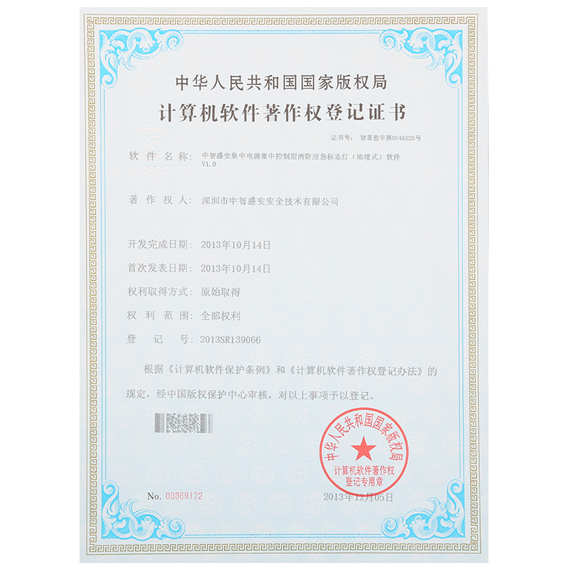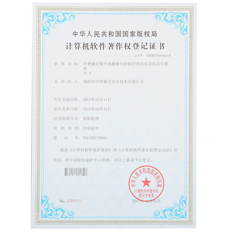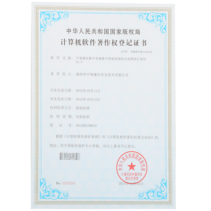 • “集中電源集中控制型應急照明燈軟件”著作權登記證書