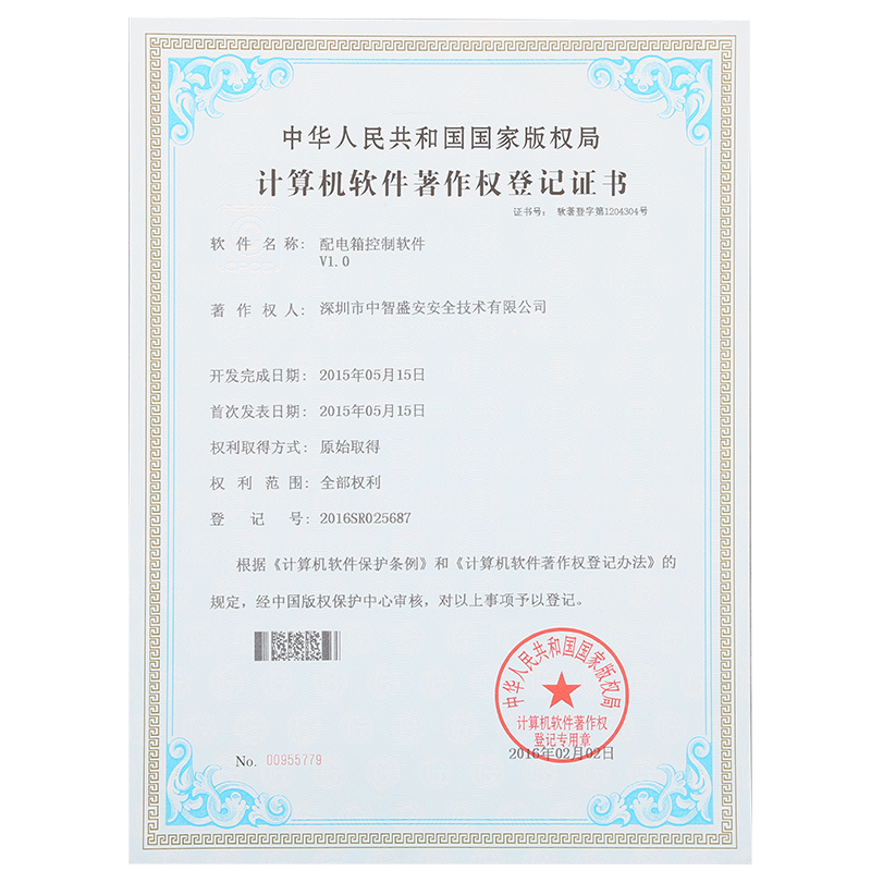 • “配電箱控制軟件”著作權登記證書