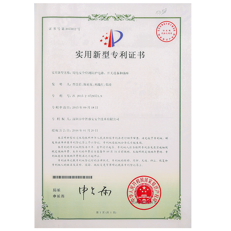 • “用電安全檢測防護電路、開關設備和插降”專利